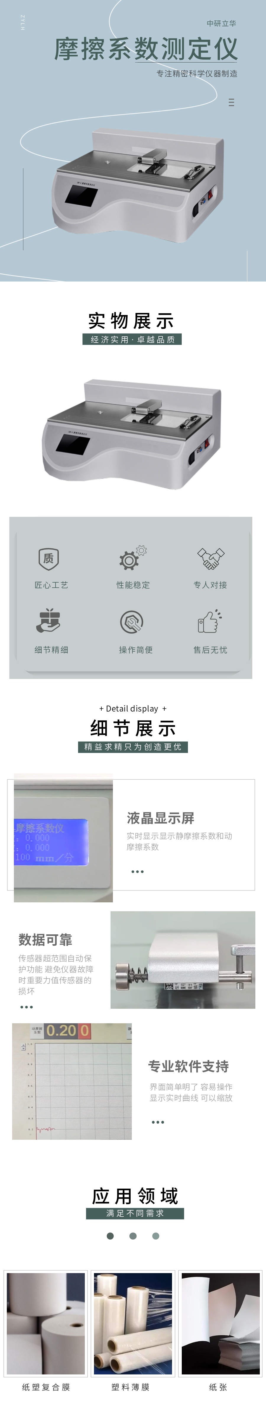 用途:用來測定塑料薄膜、薄片、紙張等材料在自身或其他材料表面滑動時的摩擦系數(shù),應用于質(zhì)檢、藥檢、科研、包裝、薄膜、食品、藥品、日化等行業(yè)。