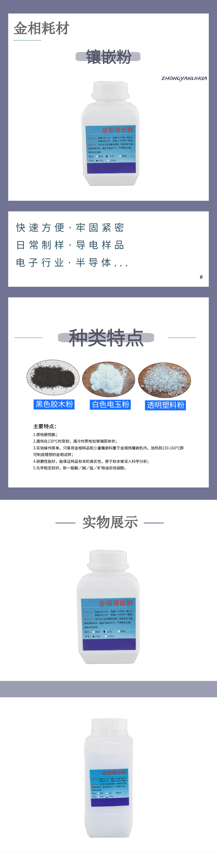 用途:適用于各種不同類型的鑲嵌機,以便于測試微小,超薄工件的硬度和觀察金相組織。選用特殊材料和特殊添加劑制作而成,在鑲嵌后與樣品結(jié)合牢固緊密,與樣品邊緣不易產(chǎn)生縫隙。