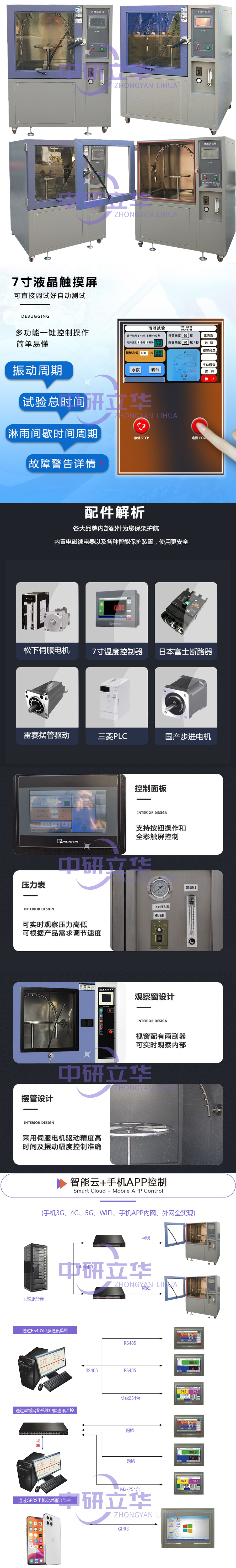 2.全儀表的控制系統(tǒng)以及變頻技術(shù)的采用,使得降雨量、試品架的回轉(zhuǎn)角度,噴水?dāng)[桿的擺動(dòng)角度以及噴水量,擺動(dòng)頻率都可自由設(shè)置及調(diào)節(jié)